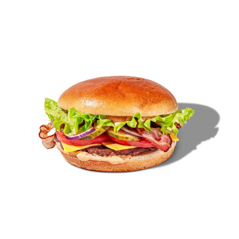 - булочка, говяжья котлета, бекон, фирменный соус, сыр чеддер, лист салата, красный лук, томаты, огурчики маринованые