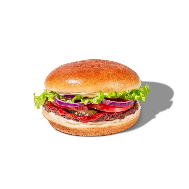 - булочка, говяжья котлета, фирменный соус, сыр чеддер, лист салата, красный лук, томаты, огурчики маринованые