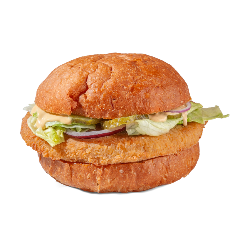 Булочка, котлета из нута (фалафель), айсберг, маринованные огурчики, красный лук, соус бургер, фирменный соус BBQ.