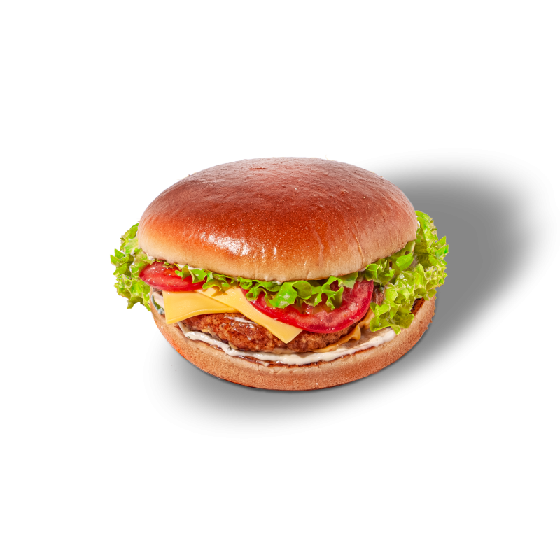 Булочка, куриная котлета, томаты, сыр чеддер, соус тар-тар, айсберг