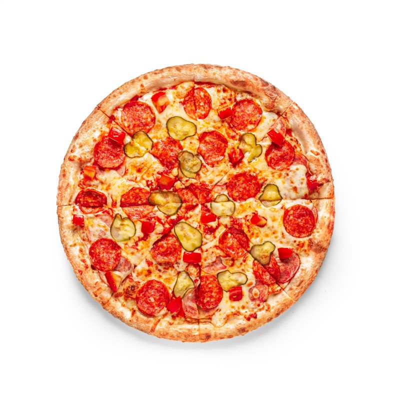 томатный соус, моцарелла, ветчина, пепперони, томат, маринованные огурчики