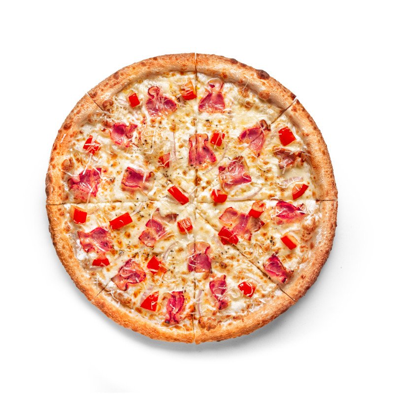 белый соус, моцарелла, бекон, томаты, красный лук, пармезан