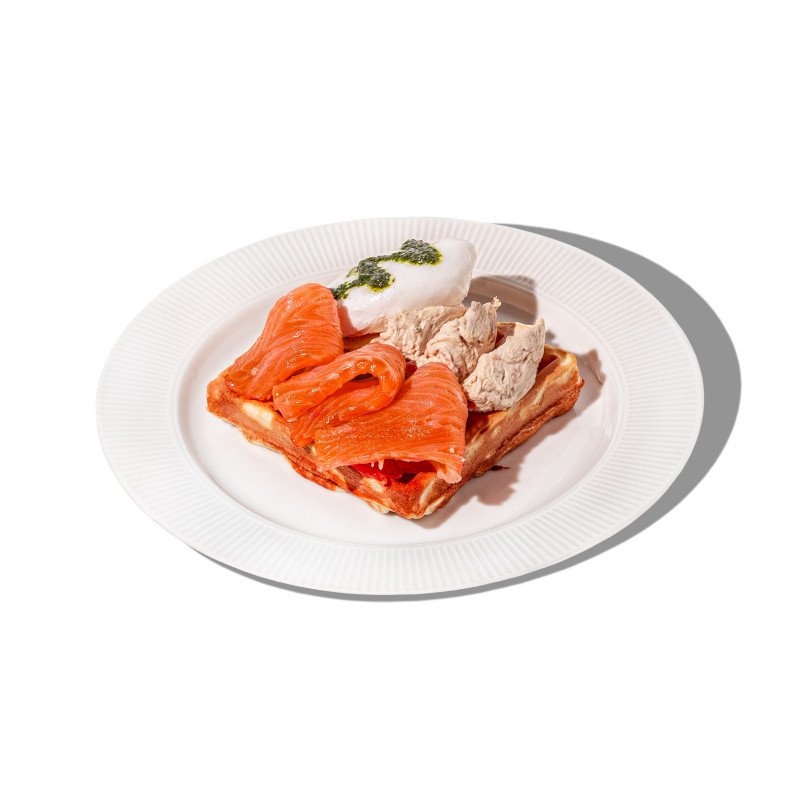 Бельгийская вафля, кремчиз с вялеными томатами, лосось, яйцо пашот, соус песто